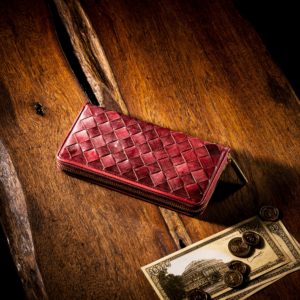 特殊な樹木を使い、抽出したタンニンを使って牛革を鞣したオークバークを贅沢に使い、編み込んだ、COCOMEISTER(ココマイスター)のラウンド長財布。